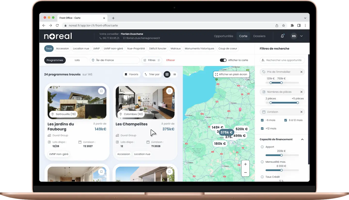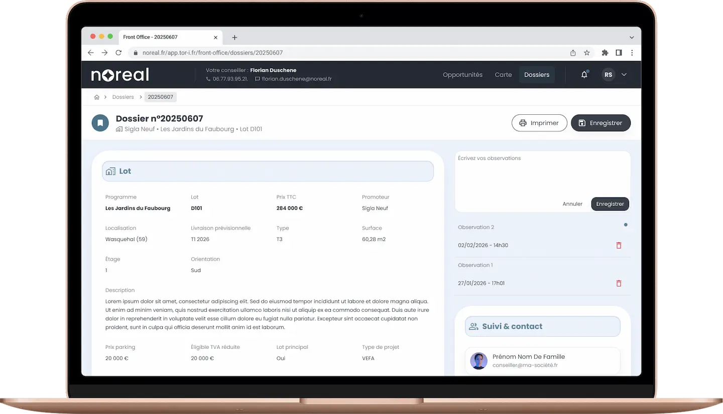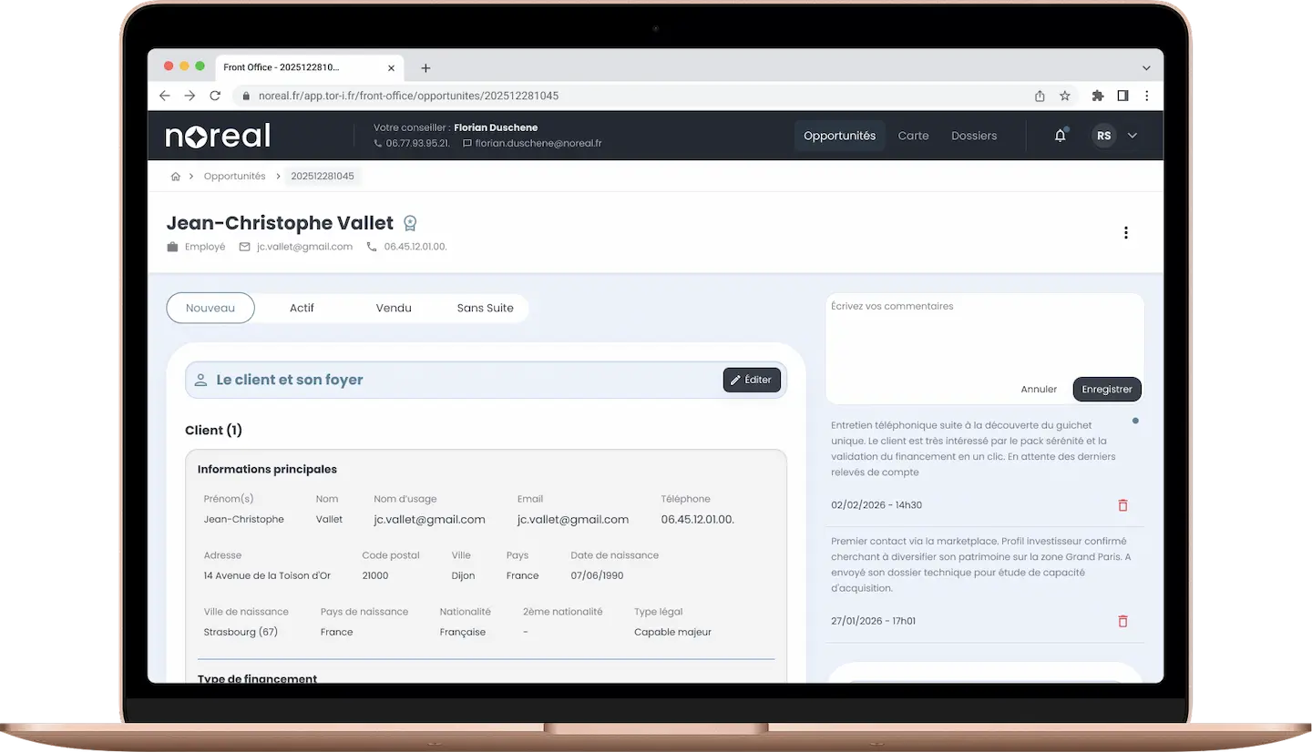 Noreal agit comme un point d’accès unique reliant tous les acteurs de la chaîne immobilière grâce à une infrastructure technologique intégrant CRM, Data, gestion des stocks en temps réel, gestion des clients et des ventes, interlocuteur privilégié.